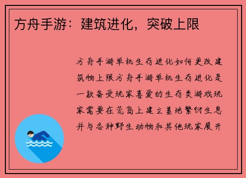 方舟手游单机生存进化是一款备受玩家喜爱的生存类游戏,玩家需要在荒岛上建立基地、繁衍生息,并与各种野生动物和其他玩家展开激烈的对抗。在游戏中,建筑物是玩家生存和发展的重要组成部分,而建筑物上限的更改对于玩家来说具有重要意义。本文将从随机8-20个方面对方舟手游单机生存进化如何更改建筑物上限进行详细阐述。